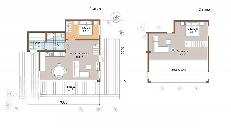 Дом выдержан в стиле минимализм, привлекая внимание лаконичностью фасада. Текстура дерева со светлым покрытием демонстрирует натуральную красоту клеёного бруса. Этот дом можно назвать жемчужиной Крыма за его деликатность и оттенок. Планировка дома предполагает воздушность, лёгкость и простор для небольшой семьи. Главная деталь - второй свет, стирающий границы двух этажей. Подобный приём наполняет дом дневным светом, что особенно важно в зимний период, когда день становится коротким и не хочется упустить ни секунды солнца. А в период рассвета и заката дом будет освещаться уникальными красками. Две спальни расположены на двух этажах, по соседству со спальней на втором этаже расположена ещё одна гостиная, которую можно превратить в гостевую, детскую или игровую.- Площадь: 130