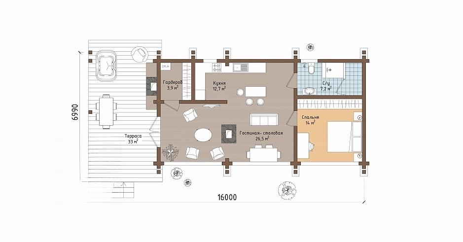 Дом «Фаворит» - это небольшое по размерам, но великое по комфорту строение: посмотрите, одна терраса чего стоит! Что на ней только не расположишь - квадратные метры открывают возможности для создания уюта, как с картинки. Попадая в дом, мы видим гостиную-столовую, которая так и манит задержаться здесь подольше и насладиться уютом. Что удобно - рядом со входом в дом располагается гардероб. Кухня хоть и отделена от гостиной-столовой, но открытость пространства сохраняется. В доме всего одна средних размеров спальня и один санузел.- Площадь: 97