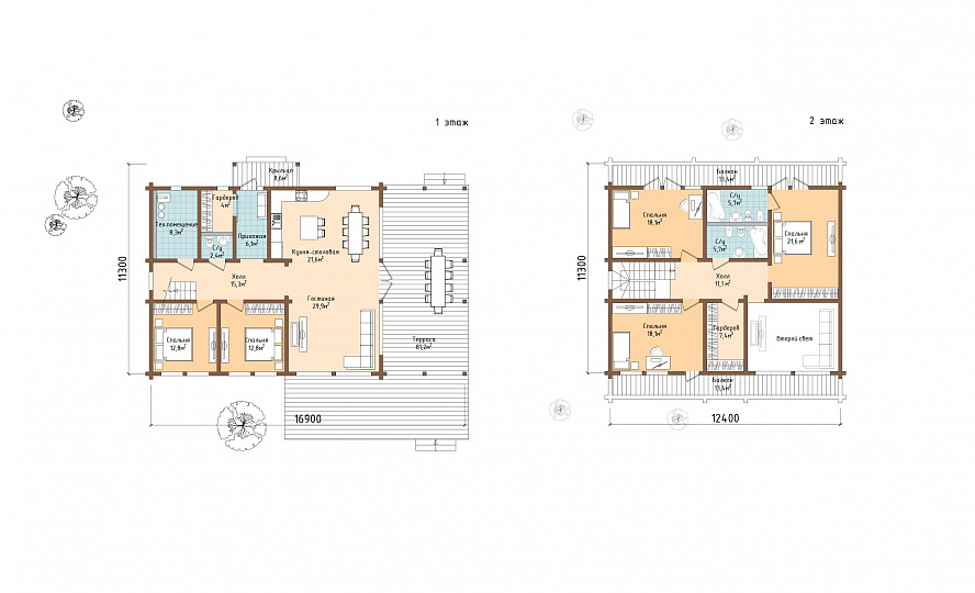 Простая, но изысканная форма, контрастная отделка фасада из бруса темного и светлого оттенка, двускатная кровля с длинными фронтонами и боковыми свесами, большие панорамные окна, цоколь, отделанный натуральным камнем – дом будет неизменно привлекать внимание окружающих своей гармоничностью с природой и в то же время актуальным внешним видом. Общая площадь дома составляет 318 кв. м., жилая – 210, здесь может с комфортом проживать семья из 4-5 человек. Панорамные окна гостиной-столовой выходят на крытую просторную террасу, где в теплое время года можно принимать гостей, устраивать пикники и дружеские посиделки. Планировка внутри учитывает интересы каждого члена семьи и позволяет сделать жизнь на лоне природы комфортной.